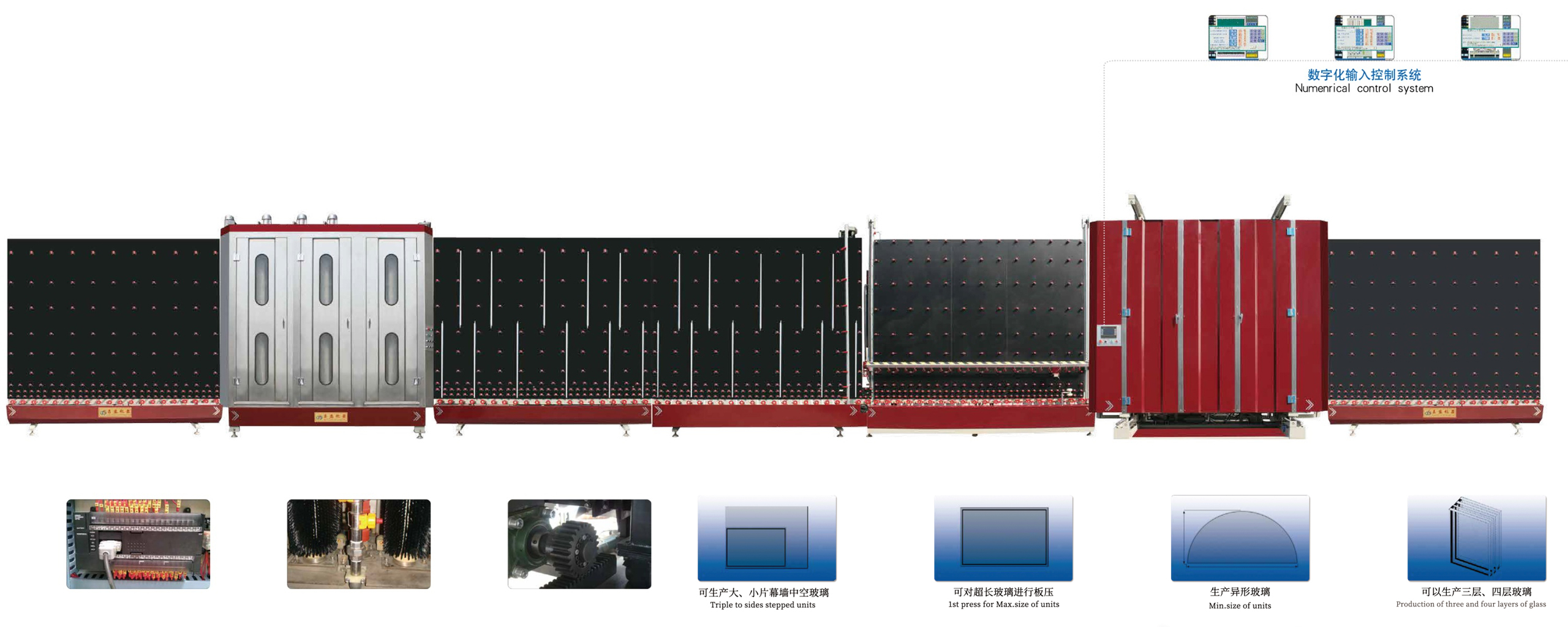 自动数控中空玻璃生产线(可生产LOW-E中空玻璃) 清洗机采用3对毛刷设计及对LOW-E玻璃专用毛刷避免膜损伤。